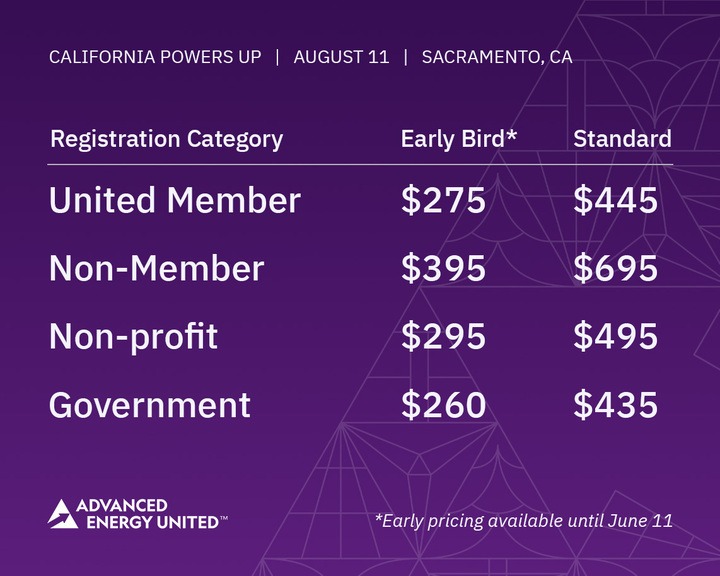 Secure your seat before June 11 to receive early bird pricing. Discounts reflected for Advanced Energy United members, non-profits, and government decision-makers. Register today.