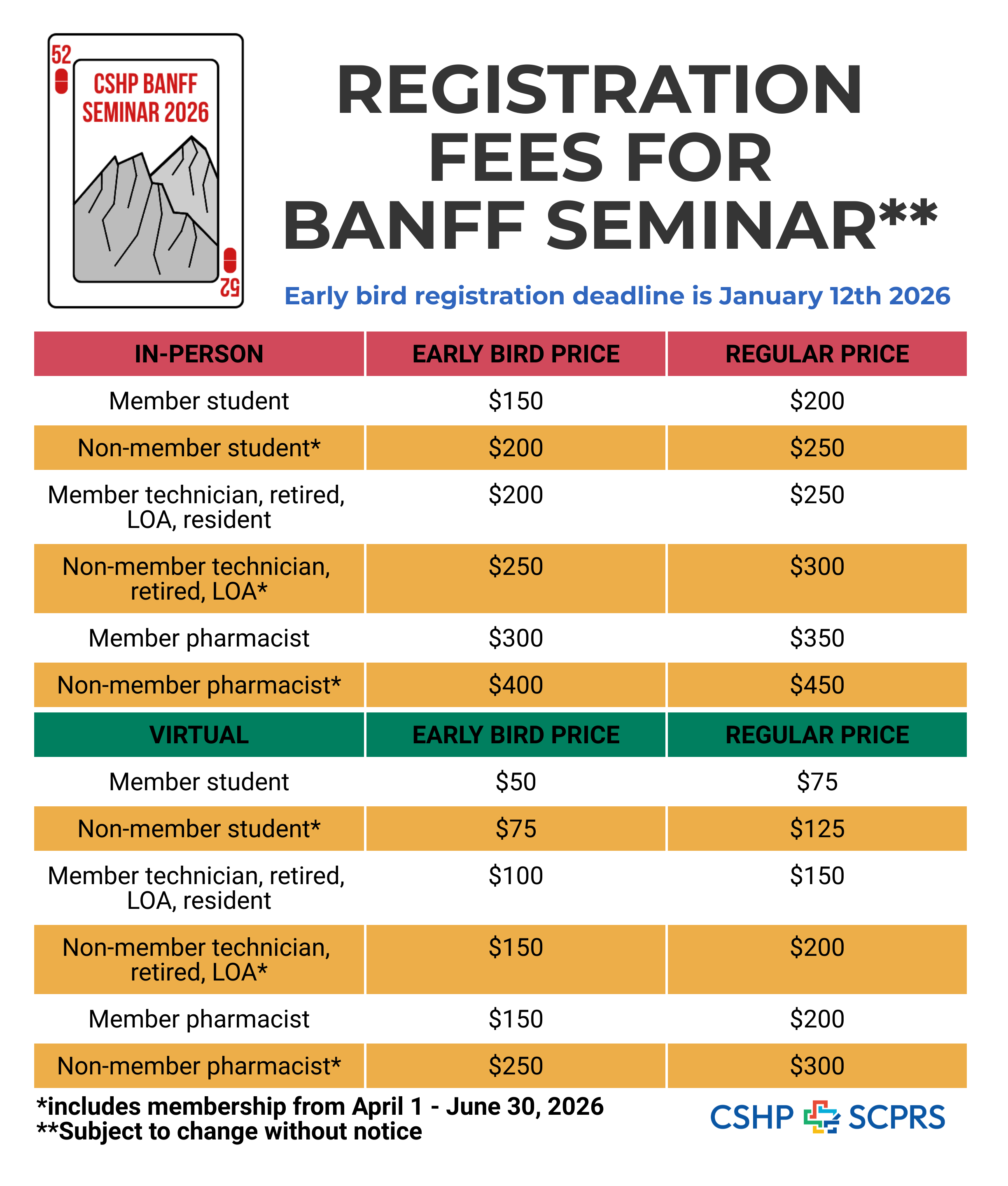 An administration fee of $15 will be charged to cancel registrations on or before January 12, 2026. A refund of 50% of the registration fee will be provided for all cancellations received between January 13, 2026 and February 25, 2026 (inclusive). Registration fees will not be refunded for cancellations received after February 25, 2026 except in extenuating circumstances. To cancel your registration, please send an email to registrar.cshpbanff@gmail.com.